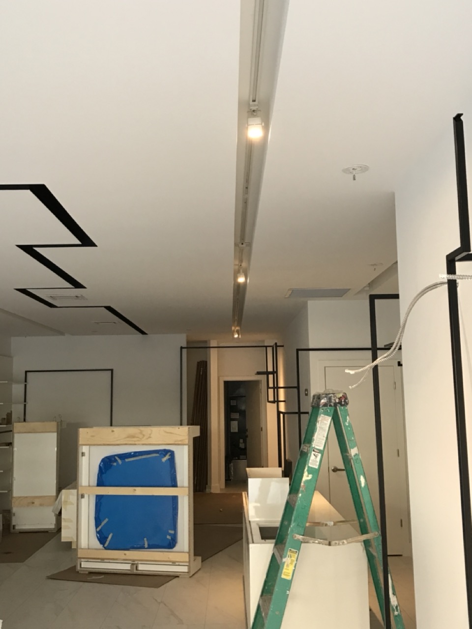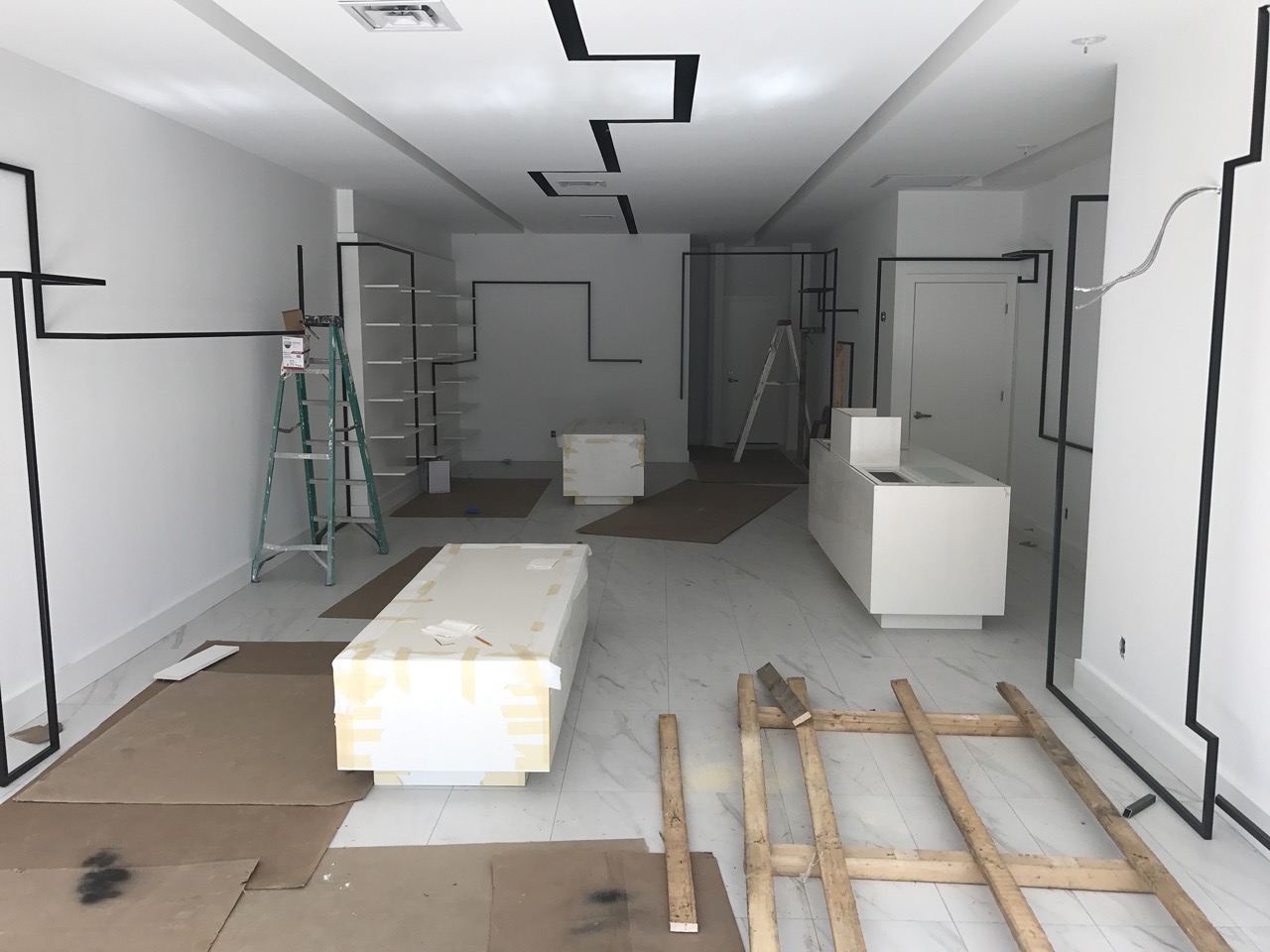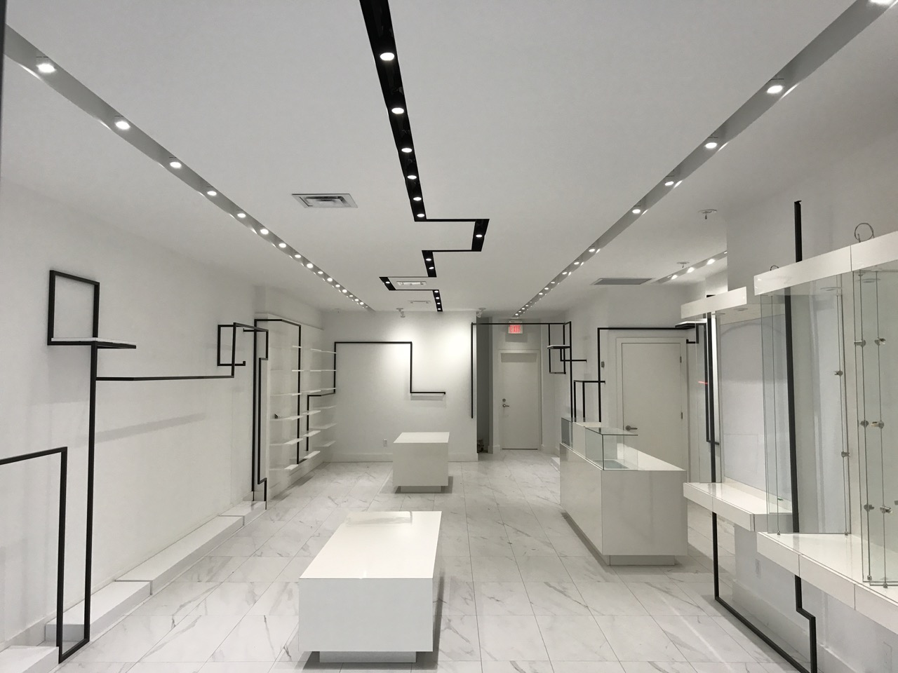 A modern renovation project for a fashion boutique in Midtown Toronto, featuring sleek metal garment hangers, minimalist lines, and custom glass window-display cabinetry. The updated space combines clean architectural detailing with high-end materials to create an elegant, contemporary retail environment that highlights merchandise with clarity and style.