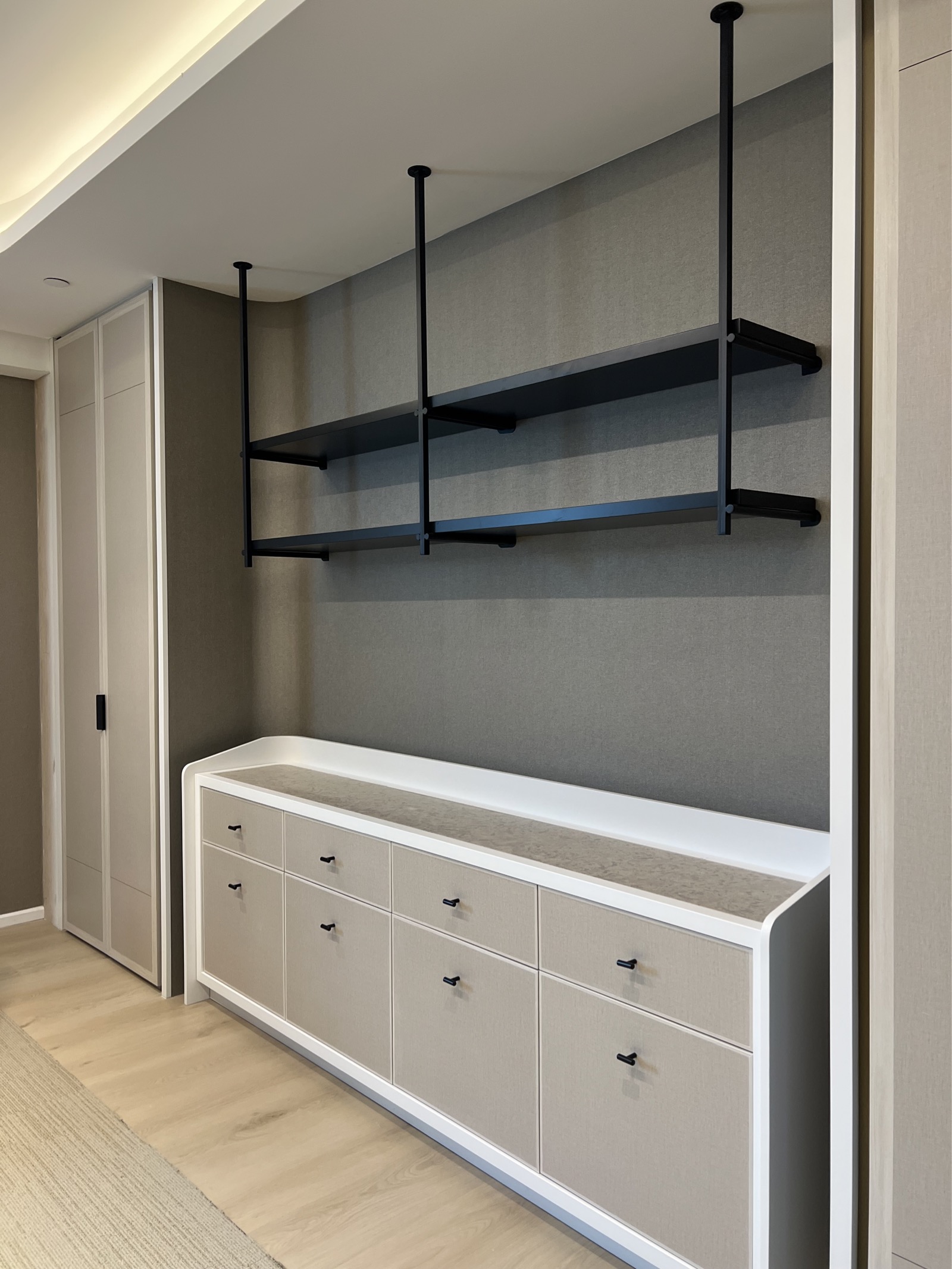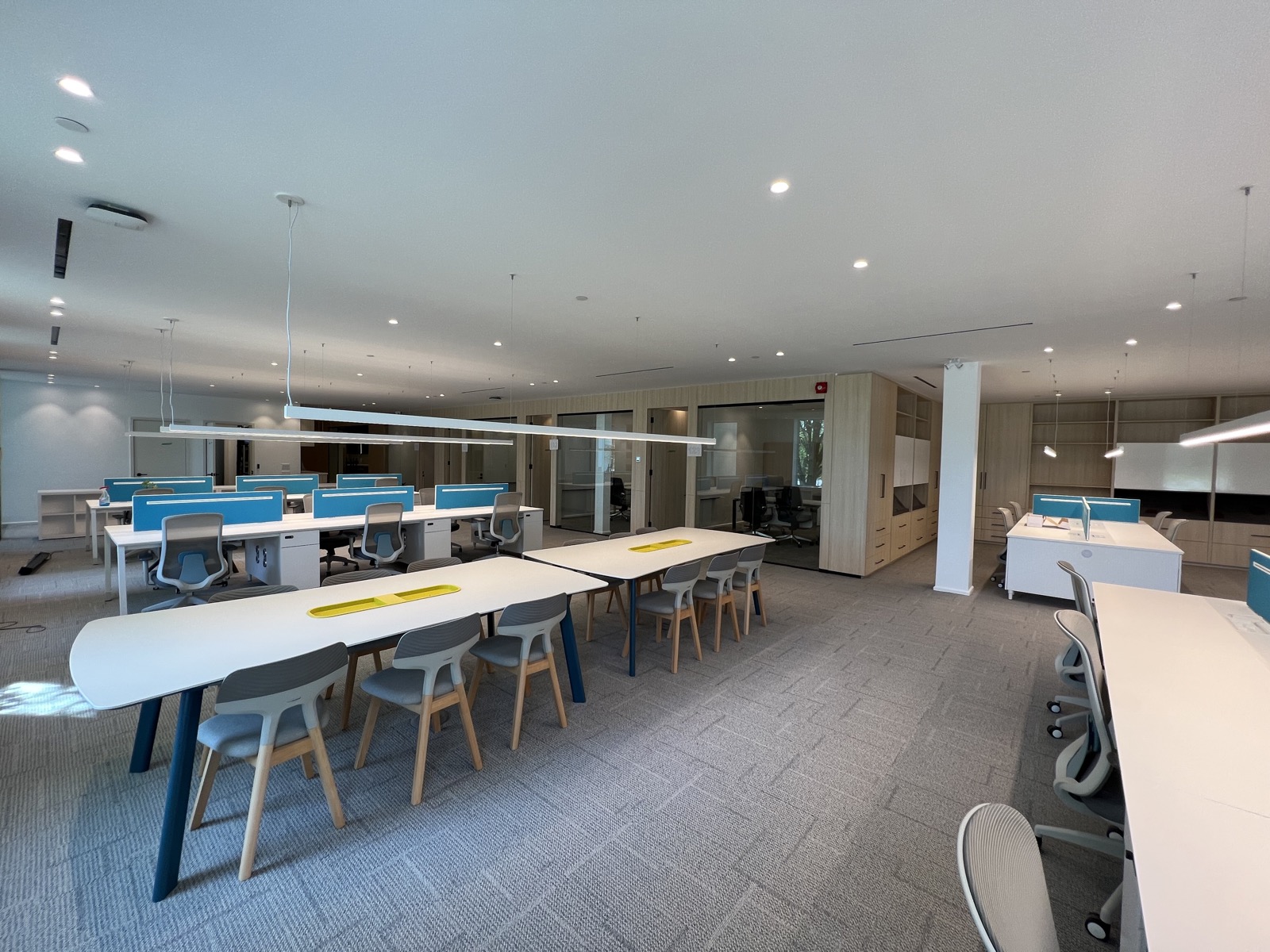 This 20,000-square-foot modern office renovation in the Aurora area transforms the building into a sophisticated, design-forward corporate space. At its heart sits a 4,000-square-foot showroom with a dramatic 24-foot ceiling, anchored by a sweeping circular staircase that creates both architectural presence and visual flow. Rich wood and sleek metal paneling wrap feature walls throughout the interior, establishing a refined material palette that extends across the lounge, private library, executive offices, and a suite of thoughtfully planned meeting rooms. The result is a dynamic, contemporary workplace that balances innovation, elegance, and everyday functionality.