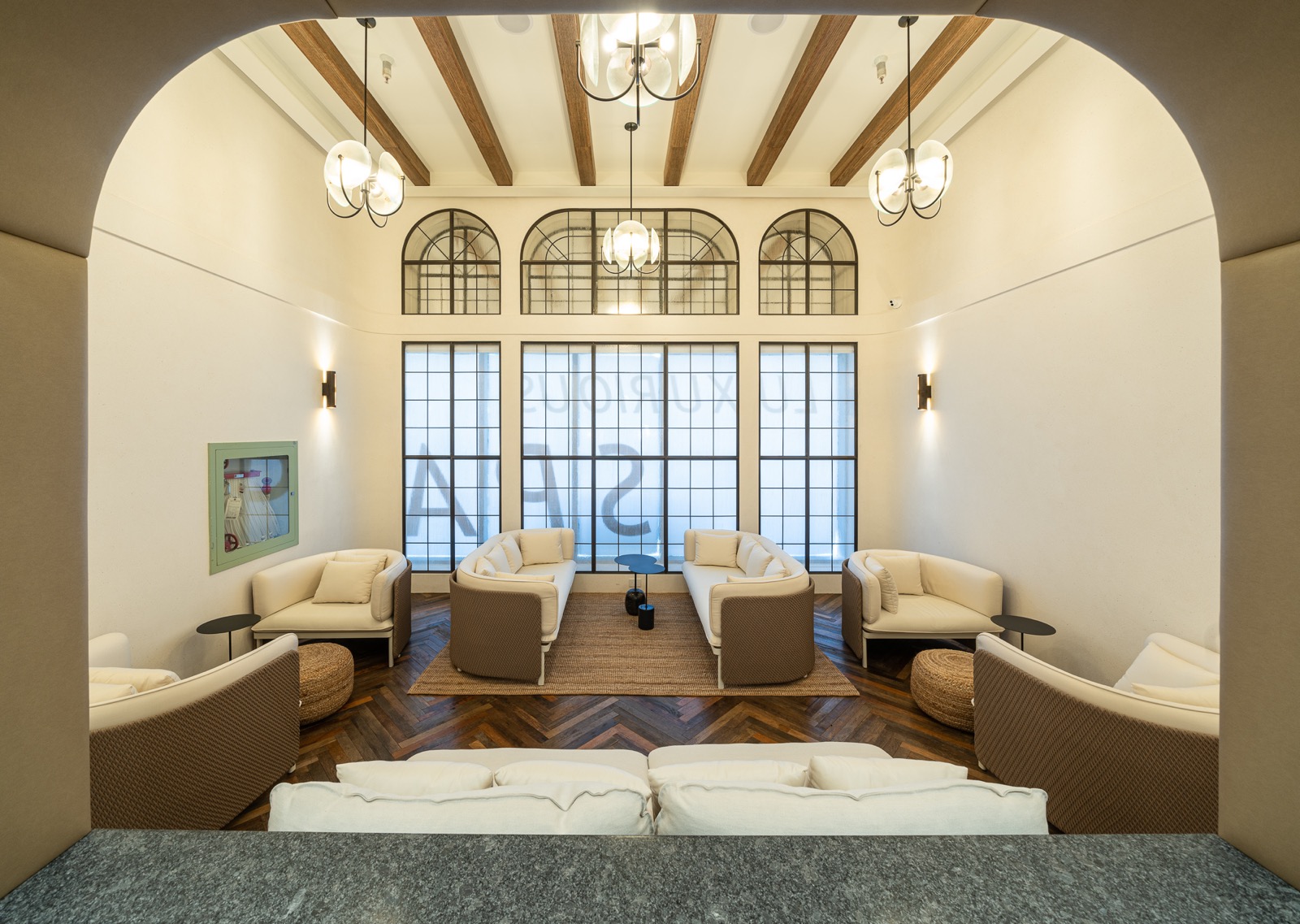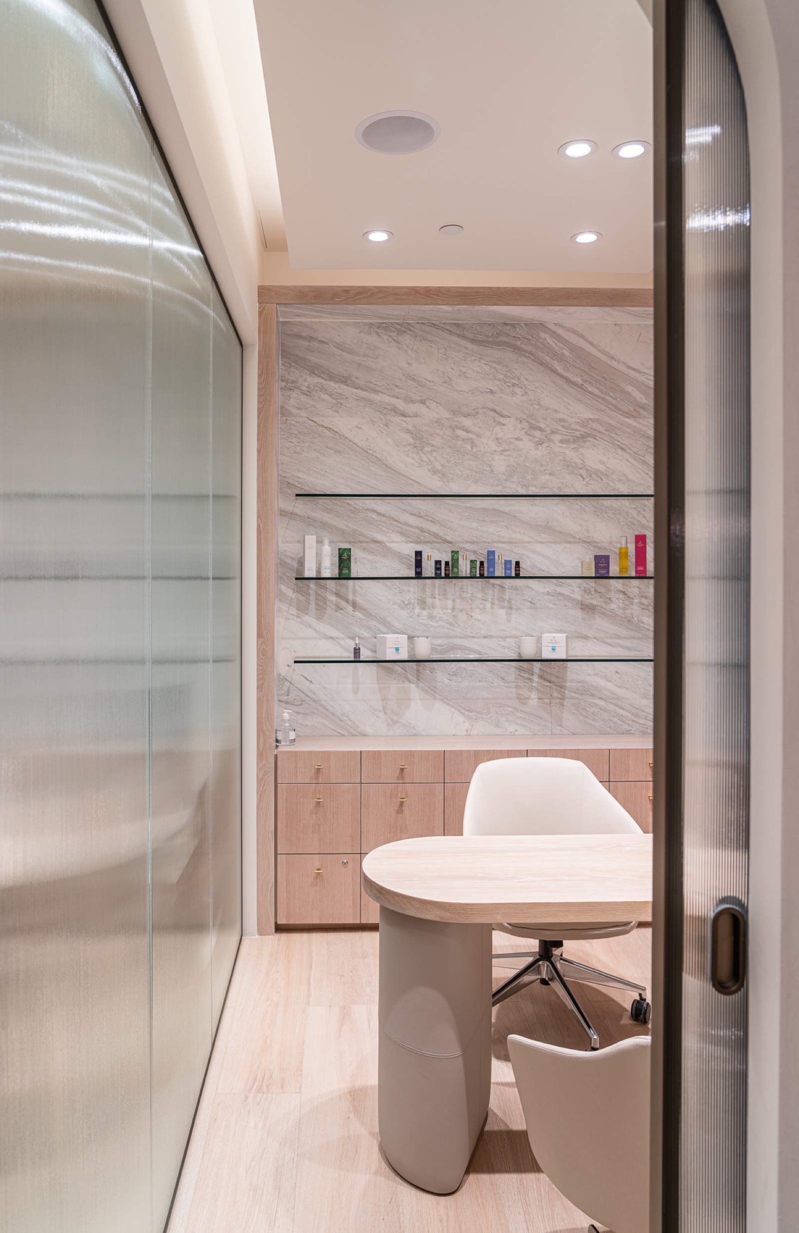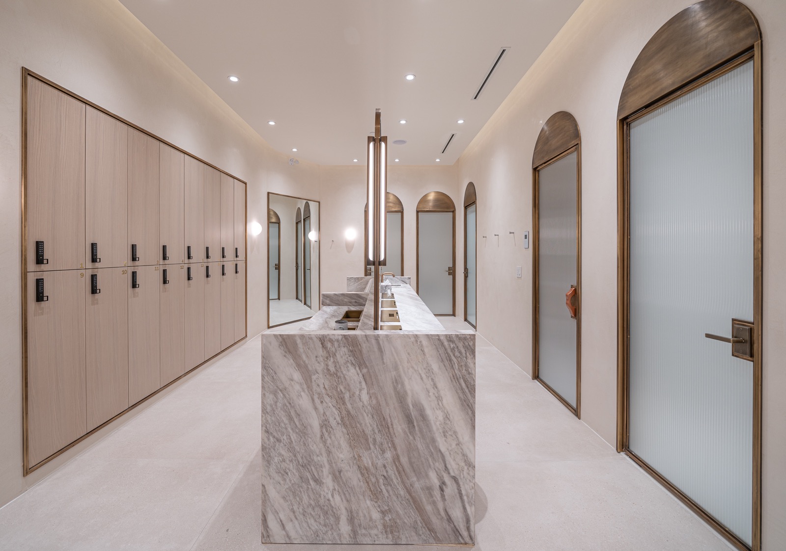 This 6,000-square-foot luxury spa renovation reimagines the space as an immersive sanctuary defined by exquisite architectural design. A sweeping dome ceiling introduces the spa’s sense of grandeur, complemented by artisanal Venetian plaster that softens and enriches each room. The reception area is anchored by a custom Italian marble desk and matching makeup tables, while a monolithic Krion bar island with seamlessly integrated sinks enhances the lounge. The wellness zone includes both a steam sauna and a dry sauna, offering a complete thermal experience. With carefully selected materials imported from the U.S. and Europe, the spa embodies craftsmanship, serenity, and world-class luxury.